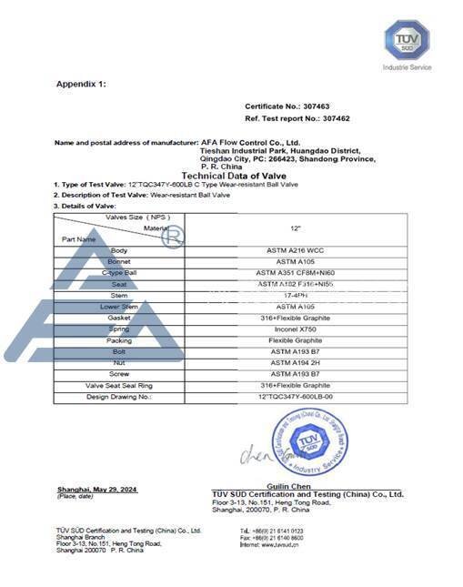 API 6FA防火证书是石油天然气行业阀门防火性能的重要认证,要求阀门在火灾等极端情况下仍能保持一定的密封性能,阻止火势蔓延,保障人员安全。AFA一直非常重视产品质量和技术创新,此次API 6FA证书的获得,标志着公司在阀门防火性能方面的技术实力得到了行业的高度认可,也印证了我司上装C型耐磨球阀在各类严苛工况下的适应性。