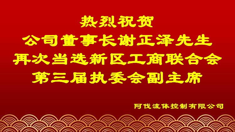 壹号娱乐-com流体控制有限公司董事长谢正泽先生再次当选西海岸新区工商业联合会第三届执行委员会副主席,公司全体员工向董事长谢正泽先生再次当选表示热烈的祝贺。