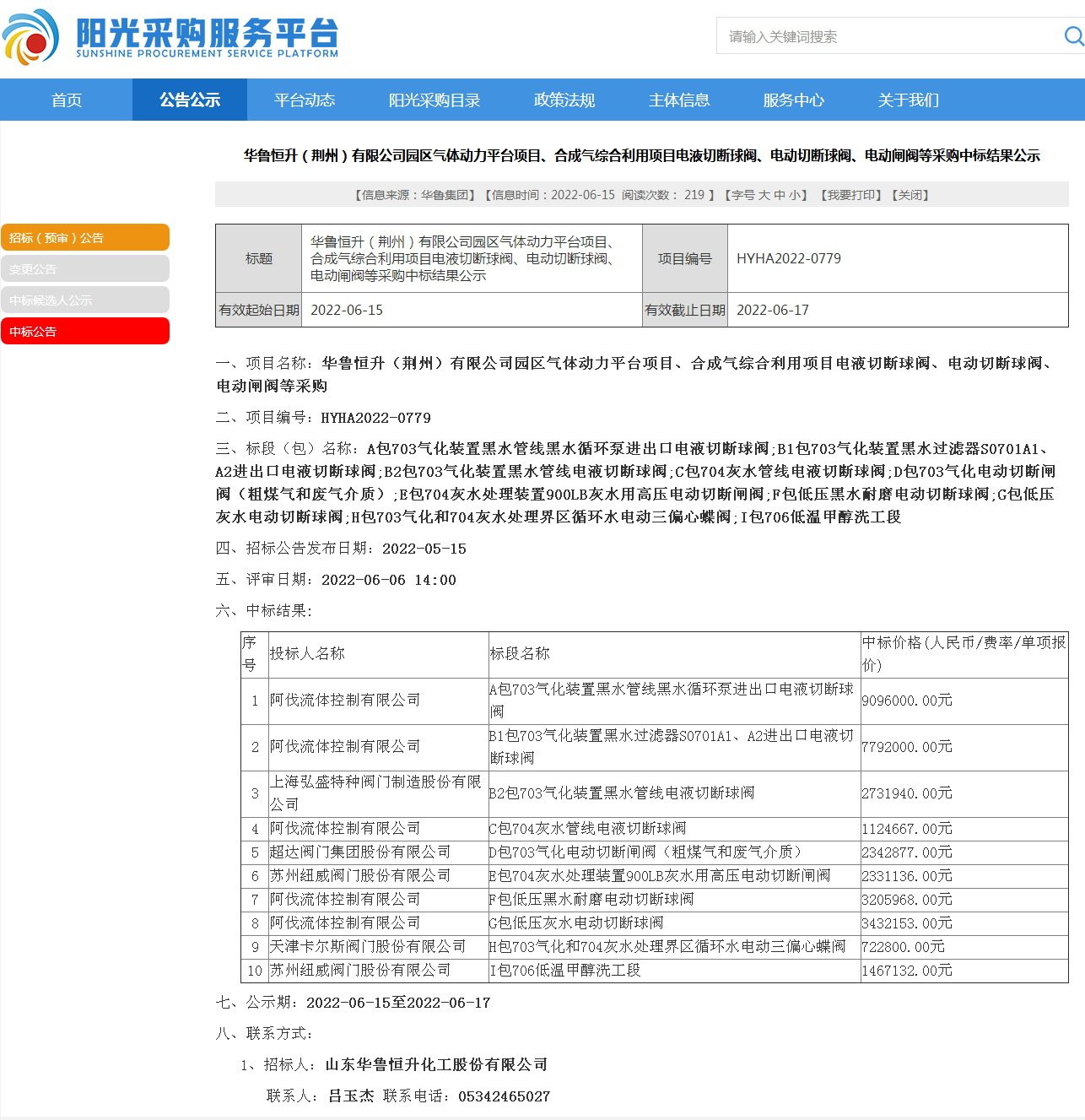 2022年6月份,壹号娱乐-com流体控制有限公司(以下简称AFA公司)在华鲁恒升(荆州)有限公司园区气体动力平台、合成气综合利用项目耐磨球阀采购招标中再获大批订单。