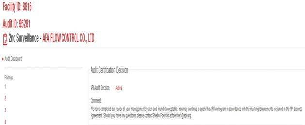 因受新一波疫情蔓延影响,近日美国石油协会正式向AFA公司发放了此次通过API会标认证监督审核的书面意见。