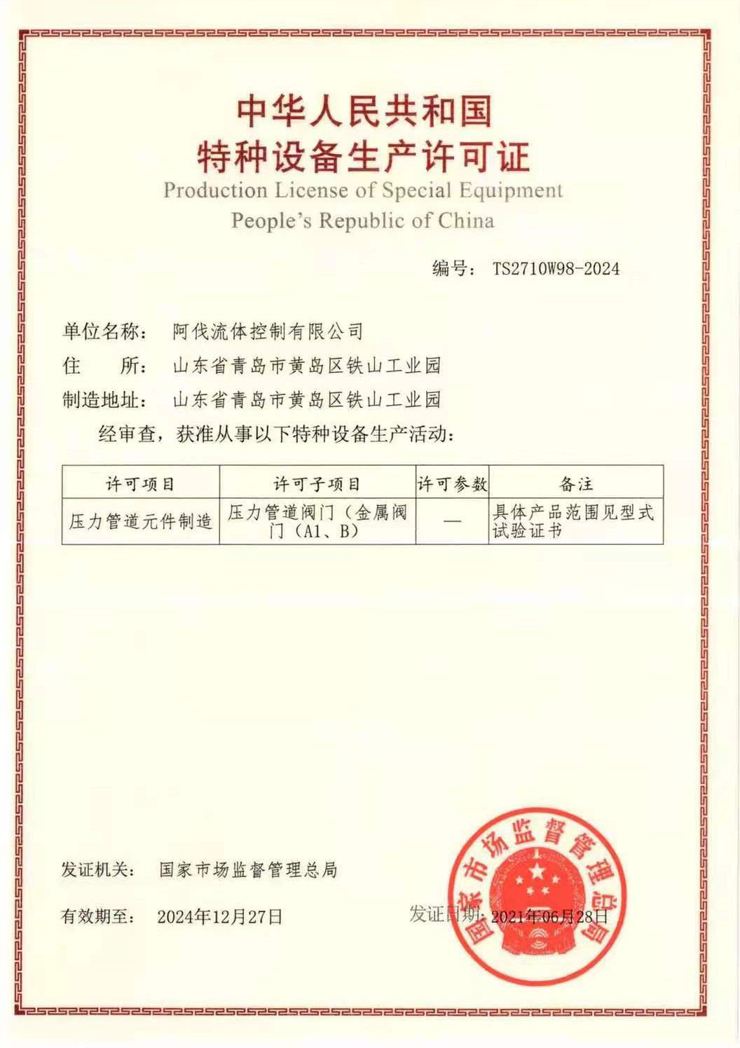 2021年7月5日,新换发特种设备制造许可证(压力管道元件:金属阀门(A1、B)已发至我们公司。